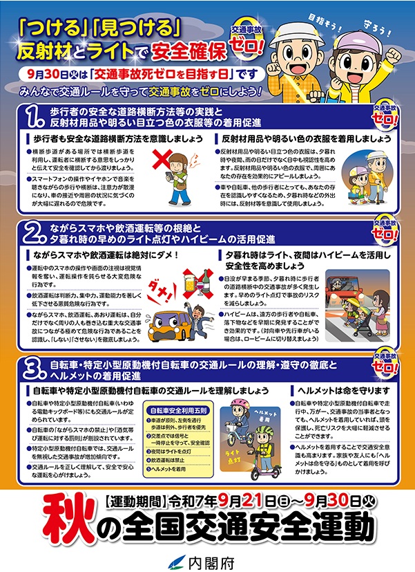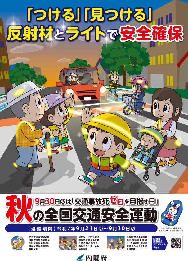 暑かった夏の陽気も徐々に秋らしくなり始め、今年も9/21(日)~9/30(火)まで【秋の全国交通安全週間】が行われています。期間中の9/30(火)を「交通事故死ゼロを目指す日」と定め、皆さんが道路交通環境の改善に向けた取組を推進することにより、交通事故防止の徹底を図ることを目指しています。