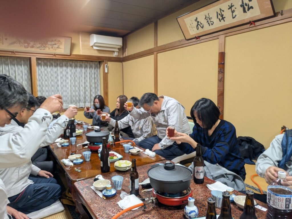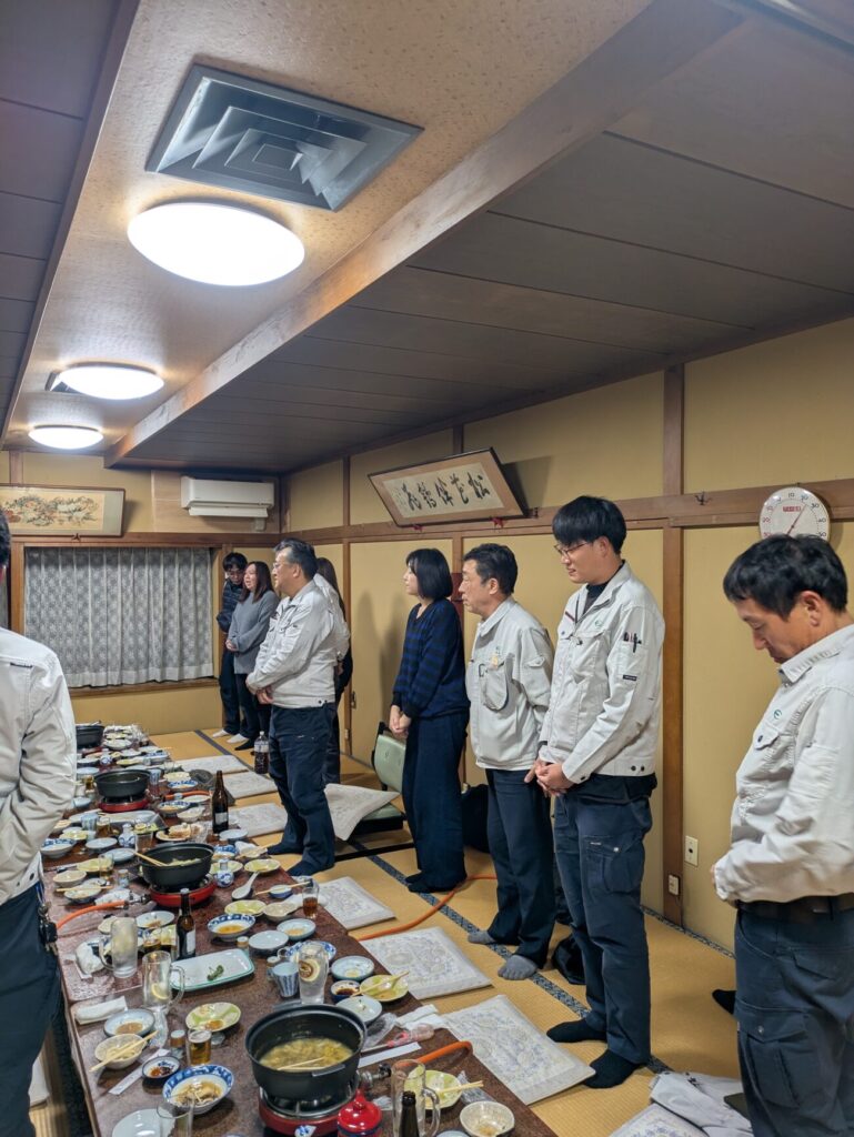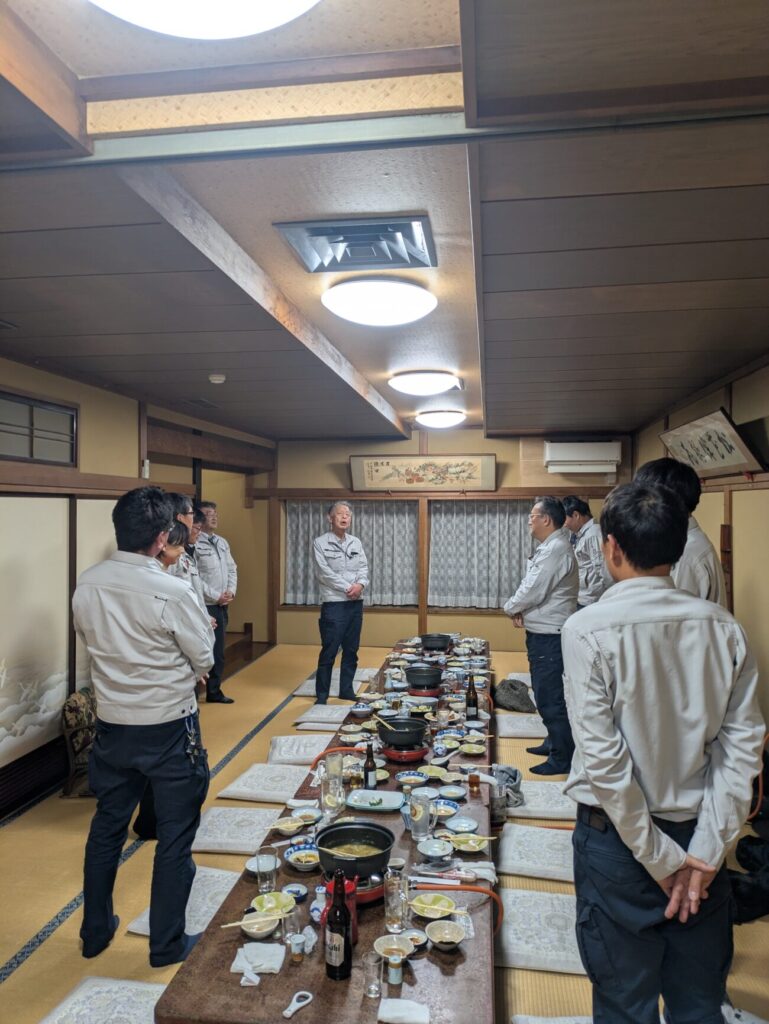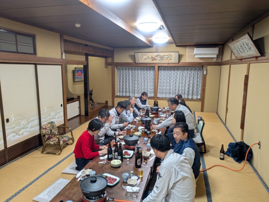 令和7年12月12日 18:00~ 板屋精肉店にて 年の瀬も迫り、何かと気忙しい時期となりましたが当社でも一年の労をねぎらって忘年会を開催致しました。その日は北海道や東北~日本海にかけて大雪の警報が出ているようなとても肌寒い陽気だったためか、体を温めるために美味しいお酒がすすんでしまいとても楽しい夜になりました。今年もあと少し。寒さに負けず頑張っていきたいと思います。