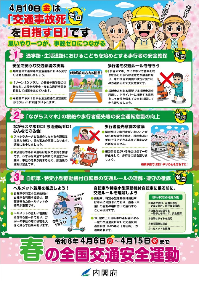 2026年春の全国交通安全運動は4月6日から15日まで実施され、4月10日が「交通事故死ゼロを目指す日」となります。特に今年は自転車に対する交通ルールが大きく変わりました。自転車に乗るときも車のドライバーとして自転車の近くを走行するときも厳しい罰則が追加されてます。
